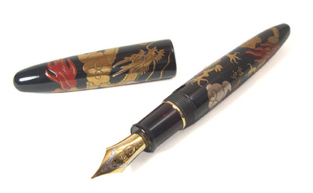 Moreover, the body is decorated with the several hundreds years old Japanese artistic traditional work, which the Japanese are proudly showing to the world, the craft known as “Kaga Makie”. The Kaga makie artist, the second generation, Ooshita Kousen, in the Takamakie requiring the higest technique, created the heaven ascending “Dragon”, which makes this pen body a fine artwork and a masterpiece.